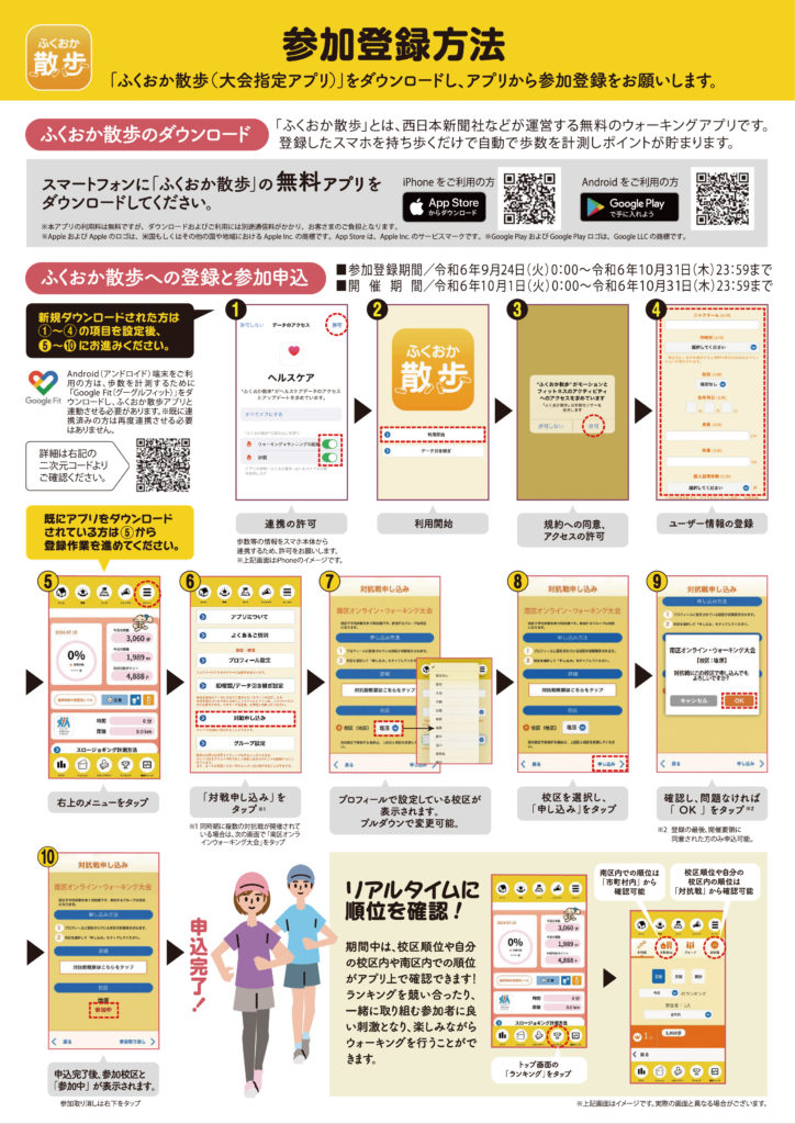 このイベントは「ふくおか散歩」アプリを活用し、スマートフォンを万歩計代わりに持ち歩くことで自動に歩数が計測され、オンライン上で参加者と総歩数を競う大会です。