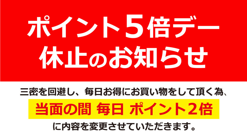 新型コロナウイルス感染拡大防止の観点から、5倍ポイントデーでのお客様の集中を避け、三密を回避する為、また毎日お得にお買い物をして頂く為に、