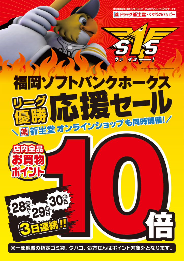 新生堂薬局では、28日(水)・29日(木)・30日(金)の3日間、『福岡ソフトバンクホークスリーグ優勝応援セール』として全品ポイント10倍を開催いたします。