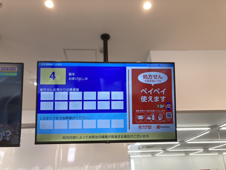 お薬のご用意ができたら、スクリーンでの呼び出し。お買い物から戻ってきたら、お薬ができているか確認ができます。