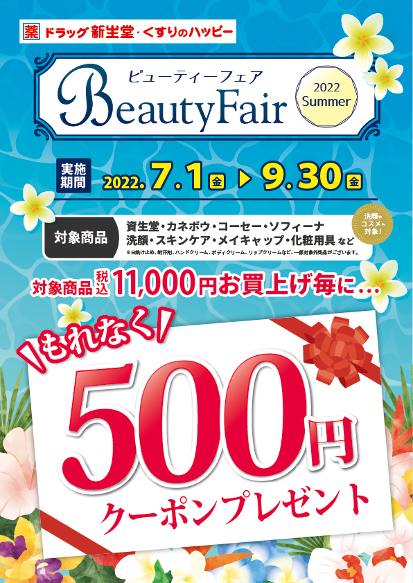 7/1から9/30までの期間中、ドラッグストア店舗全店で「ビューティーフェア 2022 Summer」を開催いたします。