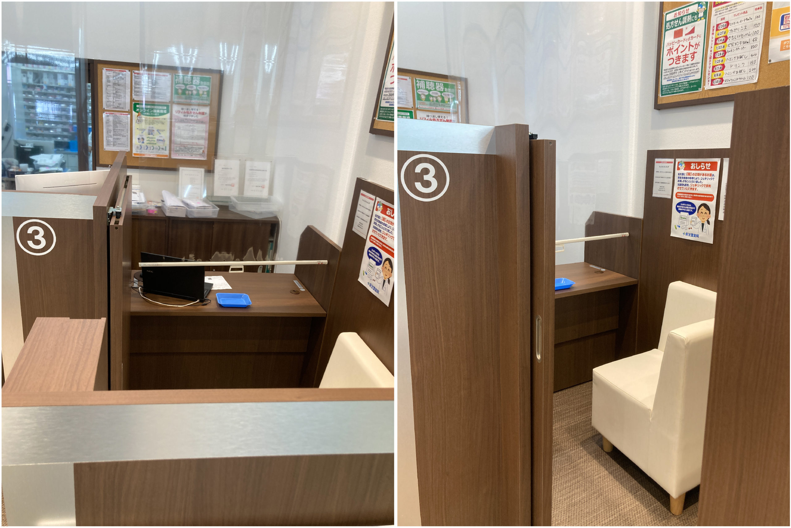調剤スペースが店舗奥へ移動し、調剤スペースが拡大し、待合室も広くなりました。