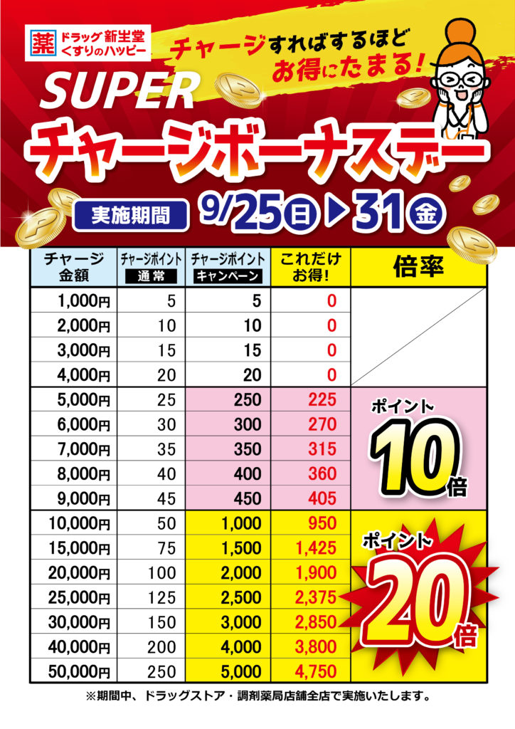 9/25から9/30までの期間中、ドラッグストア及び調剤薬局全店で「スーパーチャージボーナスデー」を開催いたします。