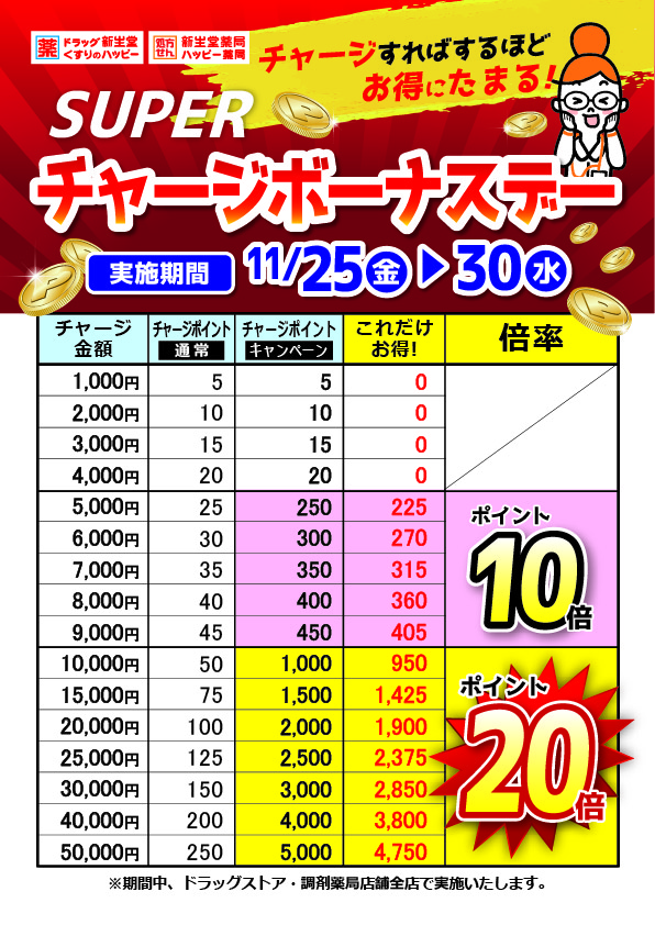 11/25から11/30までの期間中、ドラッグストア及び調剤薬局全店で「スーパーチャージボーナスデー」を開催いたします。