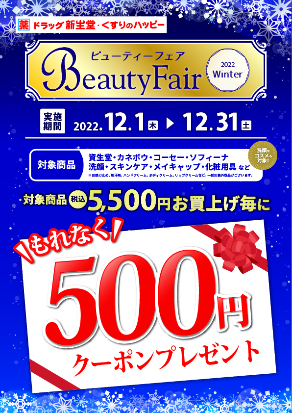 12/1から12/31までの期間中、ドラッグストア店舗全店で「ビューティーフェア 2022 Winter」を開催いたします。(国道店・有家店・稲築病院前店を除く)