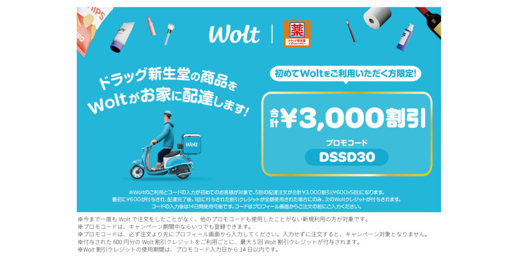 プロモコード「DSSD30」を入力で最大3,000円分のWolt割引クレジットをプレゼント