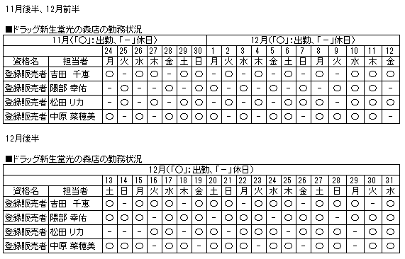 | 通常相談時及び緊急時の連絡先 | [当店への連絡先] ドラッグ新生堂 光の森店 連絡先:096-285-7672 |