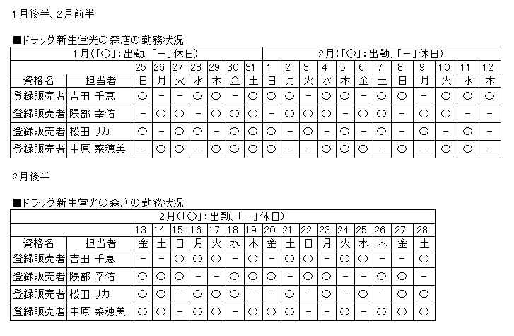 - 薬剤師不在時は要指導医薬品及び第一類医薬品売場を、薬剤師及び登録販売者不在時には許可を受けた医薬品売場を閉鎖し、医薬品の販売を中止します。