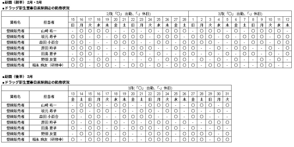 ●ドラッグ新生堂春日原駅前店 ・実店舗の営業時間: 月~日曜日、不定休 午前9時00分~午後10時00分 ・アプリ販売、インターネット販売の営業時間: 月~日曜日、不定休 午前9時00分~午後9時00分 |