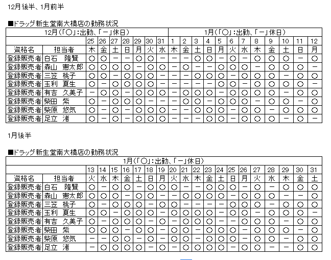 ●ドラッグ新生堂南大橋店 ・実店舗の営業時間: 月~日曜日、不定休 午前9時00分~午後11時00分 ・アプリ販売、インターネット販売の営業時間: 月~日曜日、不定休 午前9時00分~午後10時00分 |