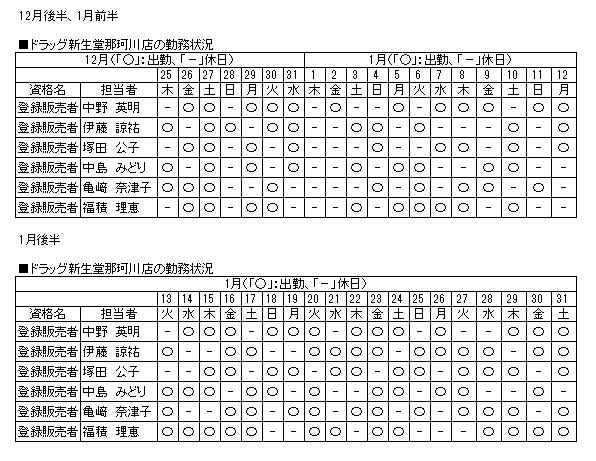 ●ドラッグ新生堂那珂川店 ・実店舗の営業時間: 月~日曜日、不定休 午前9時00分~午後11時00分 ・アプリ販売、インターネット販売の営業時間: 月~日曜日、不定休 午前9時00分~午後10時00分 |