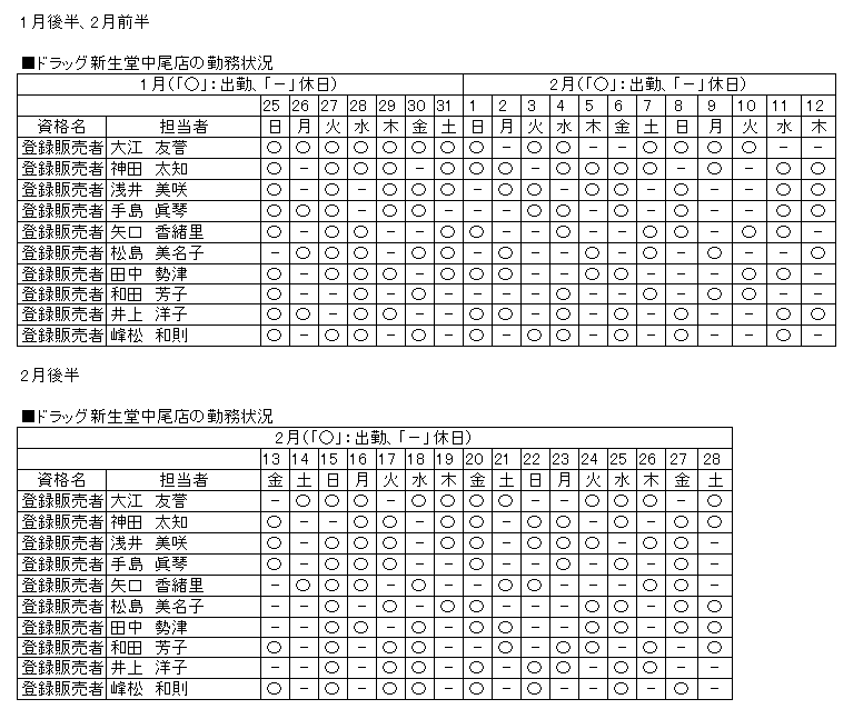●ドラッグ新生堂中尾店 ・実店舗の営業時間: 月~日曜日、不定休 午前9時00分~午後11時00分 ・アプリ販売、インターネット販売の営業時間: 月~日曜日、不定休 午前9時00分~午後10時00分 |