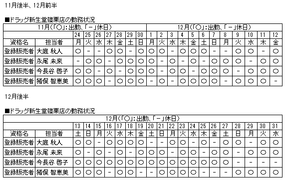 | 当該店舗に勤務する 資格者の氏名、担当業務等 |