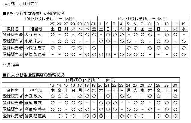 - 薬剤師不在時は要指導医薬品及び第一類医薬品売場を、薬剤師及び登録販売者不在時には許可を受けた医薬品売場を閉鎖し、医薬品の販売を中止します。