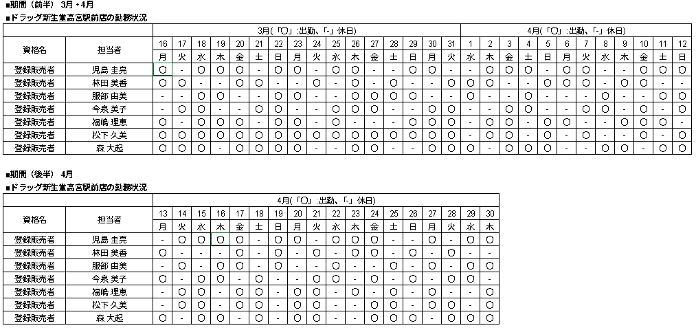 ●ドラッグ新生堂高宮駅前店 ・実店舗の営業時間: 月~日曜日、不定休 午前9時00分~午後10時00分 ・アプリ販売、インターネット販売の営業時間: 月~日曜日、不定休 午前9時00分~午後9時00分 |