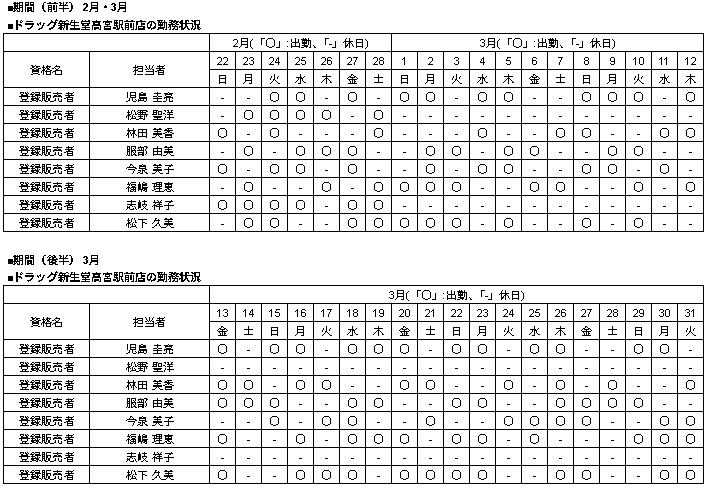 | 通常相談時及び緊急時の連絡先 | [当店への連絡先] ドラッグ新生堂高宮駅前店 連絡先:092-533-5005 |
