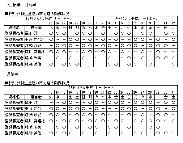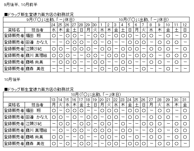 | 通常相談時及び緊急時の連絡先 | [当店への連絡先] ドラッグ新生堂徳力南方店 連絡先:093-965-6033 |