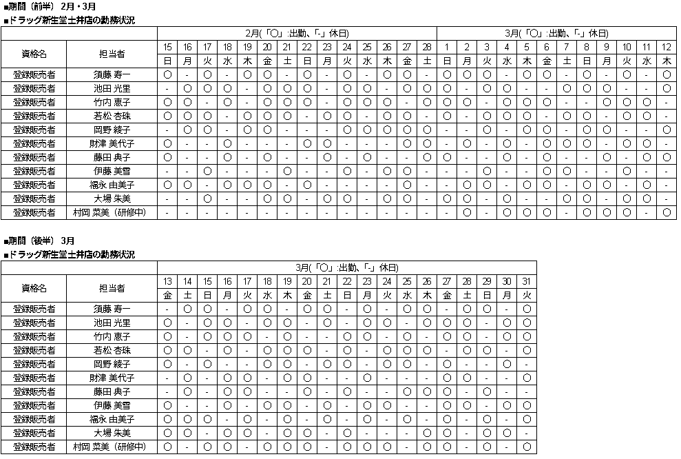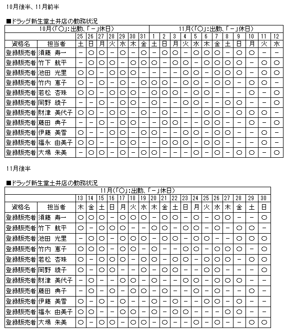 ●ドラッグ新生堂土井店 ・実店舗の営業時間: 月~日曜日、不定休 午前9時00分~午後11時00分 ・アプリ販売、インターネット販売の営業時間: 月~日曜日、不定休 午前9時00分~午後10時00分 |