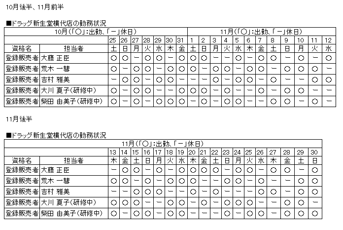 ●ドラッグ新生堂横代店 ・実店舗の営業時間: 月~日曜日、不定休 午前9時00分~午後10時00分 ・アプリ販売、インターネット販売の営業時間: 月~日曜日、不定休 午前9時00分~午後9時00分 |
