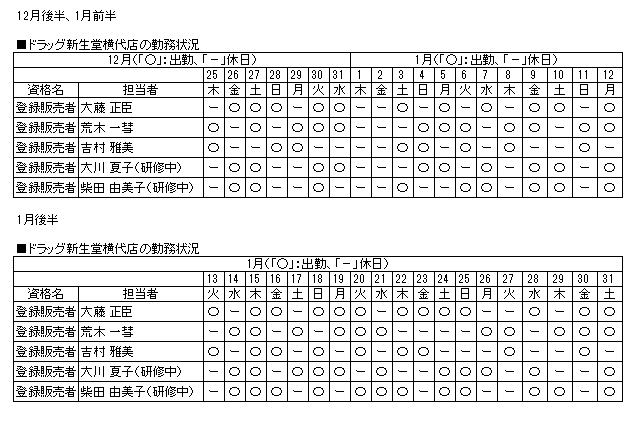 登録販売者:荒木 一彗 登録販売者:吉村 雅美 登録販売者:大川 夏子(研修中) 登録販売者:柴田 由美子(研修中) |
